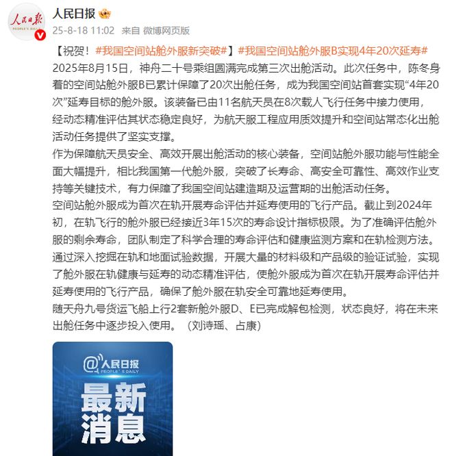 资料来源:2025年8月15日,深圳人民每日微博,成功完成了第三次活动。在此任务期间,陈东B的额外机舱服务已在限制外完成了20个任务,成为我国家空间站的首次额外的机舱服务,以实现其长寿目标“四年内20次”。该团队在8个载人飞行任务中由11名宇航员传输。经过动态和精确的评估,其状况稳定且良好,提供了强有力的支持,以提高空间诉讼工程应用程序的质量和效率以及机舱外标准化空间站的活动。与我所在国家的第一代外发服务相比长寿,高安全性和可靠性以及有效的运营支持。空间站的外部服务已成为第一个进行生活评估并延长轨道上使用寿命的飞行产品。 2024年初,赛道上飞行的机舱外的厨房用具达到了三年来限制的15倍限制。为了准确评估外部团队的剩余使用寿命,该团队对科学和理性生活,健康监测计划和职业检测方法进行了评估。深层沉浸在数据和土地测试数据中可以验证材料和产品的大量测试,以实现对设备延迟的外部的健康和预期寿命的动态和精确评估,这使得板上的措施可以使海上人员在以下方面进行以下操作,以进行船舶的评估以及生命的扩展。两个新的D和E外部服务器已脱离在Tianzhou 9负载航天器中,已完成的未包装检查,状况良好,并将逐渐在未来的输出任务中使用。 (刘shiyao,Zhan Kang)